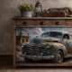 Cette pièce évocatrice reflète la dignité patinée d'une Chevrolet classique des années 1940, dressée contre un paysage spectaculaire du sud-ouest. La composition détaille de manière magistrale la patine de la voiture, où la peinture turquoise cède la place à des motifs rouillés rouillés, créant une oeuvre d'art organique du passage du temps. Le ciel dramatique, avec ses nuages colossaux et sa lumière dorée au coucher du soleil, encadre la scène tandis que des mesas lointains complètent le cadre emblématique de l'Ouest américain. La palette sophistiquée de l'oeuvre se tisse entre le turquoise vieilli, la rouille du désert et le chrome brulé contre les chauds dorures du coucher de soleil, créant une atmosphère d'Americana nostalgique qui transformera n'importe quelle pièce de mobilier en une entrée de conversation. Parfait Couleur Appareils : Patina Bleu + Rouille Désert Chrome Argent + Mesa Gold Sunset Orange + Storm Bleu Turquoise Patiné + Sable Beige Désert Rose + Acier Vintage Éléments de design captivants : Rust détaillé motifs Chrome reflets Trim formations nuages dramatiques Textes du paysage Désert Détails automobiles parfaits Détails de l'automobile Idéal Meubles Transformations : Garage Rustique Atelier Cave Cave Cave Cave coffre de rangement Armoire de style occidental de style industriel Ce design excelle dans des espaces qui célèbrent l'histoire automobile américaine et l'esthétique occidentale. Sa composition détaillée et sa patine authentique le rendent particulièrement adapté pour le garage, l'atelier ou le mobilier de jardin, où il crée une connexion immédiate à la culture automobile classique. Appliqué aux meubles, il les transforme en points focaux nostalgiques qui honorent l'attrait intemporel des voitures vintages tout en maintenant l'attrait contemporain.