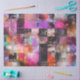 L'image est une oeuvre abstraite composée d'une grille de carrés, chacun rempli de différentes couleurs, textures et motifs. Les couleurs vont du rose vif, du violet et de l'orange aux tons plus foncés de noir et de gris. Certains carrés présentent des éclats et des rayures de peinture, tandis que d'autres ont des motifs géométriques ou des surfaces texturées. L'effet global est une composition visuellement dynamique et chaotique, avec un mélange d'éléments organiques et structurés. artwork Abstrait, grille de carrés, couleurs diverses, textures et motifs, roses vibrantes, violets, oranges, nuances foncées, noir et gris, éclaboussures et rayures, motifs géométriques, surfaces texturées, composition visuellement dynamique, chaotique, éléments organiques, éléments structurés.