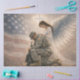 This powerful artwork blends patriotism and faith in a moving tribute to those who serve. A kneeling soldier bows his head in quiet reflection while a radiant angel stands behind him, offering comfort and protection with a gentle hand on his shoulder. Soft light glows from above, illuminating the angel’s wings and creating a sense of divine presence. The American flag forms a subtle backdrop, reinforcing themes of courage, sacrifice, and spiritual strength. Perfect for wall art, memorial pieces, or inspirational décor, this design honors both the bravery of our troops and the belief that they never stand alone.
