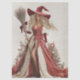 The featured design showcases a stylized witch in a holiday setting, dressed in a flowing red and cream gown with puffed sleeves, a corset bodice, and a pointed hat. She holds a ribbon-tied broomstick and wears a red gemstone necklace, while her long blonde hair cascades in soft waves. Behind her, ornamented Christmas trees and wrapped presents create a magical blend of Halloween and holiday charm — perfect for seasonal décor, fantasy themes, or whimsical mixed-media art.