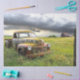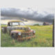 Un pick-up rouillé abandonné repose dans un champ bucolique avec une mousse verte vibrante accrochée à sa surface, juxtaposé à des clôtures en fil de fer barbelé et une vieille grange en bois sous la menace imminente de nuages de tempête noire. Cette scène évocatrice reflète l’essence de la décomposition rurale et la beauté spectaculaire des éléments de la nature. Créé par RHDesigns pour des palmes de meubles, des affiches nostalgiques et des décors maison.
