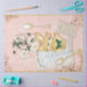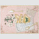 Cottagecore esthétique Papier découpage High Tea à l'aquarelle Illustrations botaniques de fleurs de cerisiers, teacup d'or antique avec papillons, cuillères à café, menu français et éphémère. Un arrière - plan en dentelle rose douce installe doucement la table. Ce dessin a été dessiné sous forme graphique par Audrey Jeanne Roberts, artiste et designer de renommée internationale, copyright.
