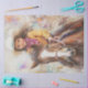L'image montre une jeune fille à cheval à un rodéo. La fille porte un casquette de cowboy blanc orné de pierres turquoise, un bandana rouge autour du cou et une chemise jaune aux motifs floraux. Le cheval est brun avec une bande blanche sur le visage et est équipé d'une bride. L'arrière - plan est un mélange coloré et abstrait de tons pastel, qui donne à l'image une ambiance dynamique et dynamique. Cette image capture l'essence d'une scène de rodéo, mettant en évidence la tenue traditionnelle et le lien entre le cavalier et le cheval. Petite fille à cheval, casquette cowboy, bandana rouge, scène rodéo, dynamique et dynamique."