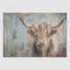 L'image montre une vache Highland avec une longue fourrure brune et de grandes cornes incurvées. La vache est ornée d'une couronne de fleurs couleur pêche et de verdure. L'arrière - plan est une surface en bois patiné et affaissée, peinte dans une couleur bleue défraîchie, avec des taches de bois apparentes et d'autres couleurs qui transparaissent. Cette image est intéressante en raison de la juxtaposition de l'aspect rustique et naturel de la vache Highland avec la délicate couronne de fleurs décoratives, dressée contre un arrière - plan texturé de style vintage. Vache Highland avec une longue fourrure escarpée et de grandes cornes courbées, portant une couronne de fleur de pêche, arrière - plan rustique en détresse, photo de vache artistique, portrait animal unique, image vintage animal, image captivante d'une vache Highland avec une longue fourrure escarpée et de grandes cornes courbées, ornée d'une belle fleur de pêche