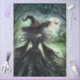 A powerful witch stands beneath the full moon in a shadowed forest, her flowing black gown adorned with lace and embroidery. Her pointed hat, decorated with flowers and feathers, adds a touch of elegance to her eerie silhouette. Wind catches her long, silver hair as bats swirl across the moonlit sky. Mist rises from a distant body of water, casting greenish hues across the leafless trees. This haunting scene blends beauty and mystery, perfect for dark fantasy storytelling, Halloween decor, or gothic-inspired branding.
