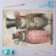 L'image montre deux chouettes anthropomorphes vêtues d'une tenue vintage et d'inspiration steampunk. Le hibou à gauche porte une chemise rose avec un col rouillé et un chapeau noir orné d'une rose rose rose. Le hibou à droite est habillé d'un look plus naturel mais accessoirisé de divers engrenages et médailles, portant également un chapeau noir avec une rose rose rose rose. L'arrière - plan présente du texte manuscrit, une horloge et des engrenages, ajoutant à la nature fantasque et artistique de l'illustration. Cette image est intéressante en raison de sa représentation créative et détaillée des hiboux dans les vêtements et accessoires humains, mélange d'éléments de la mode, de l'art, et le design steampunk. owls, chapeaux top, scrapbooking de hibou, chemise rose, roses, vintage, steampunk, arrière - plan, texte manuscrit, horloge, engrenages, lunatique, illustration détaillée, artistique, créatif, unique, anthropomorphique accessoires, mode, style, décoration, design, art