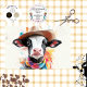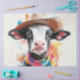 L'image présente une vache illustrée numériquement portant un casquette cowboy et un foulard coloré. Le visage de la vache est bien exposé, avec de grandes oreilles et des yeux expressifs. L'arrière - plan est rempli de éclaboussures de différentes couleurs, donnant à l'image une touche ludique et artistique vache Whimsical avec casquette cowboy, écharpe colorée sur vache charmante, éclaboussures artistiques de couleurs vives, image ludique et créative de vache, illustration du visage de la vache illustrée, numériquement personnage de vache illustré, yeux expressifs et grandes oreilles, arrière - plan animé avec des couleurs vives, atmosphère joyeuse vache avec casquette et foulard