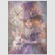 This mesmerizing steampunk fantasy artwork features a young girl dressed in an elegant Victorian-inspired purple gown, adorned with intricate lace details. She wears a grand, embellished top hat decorated with roses, gears, and golden accents, evoking a whimsical, Alice in Wonderland aesthetic. By her side sits a charming white rabbit, adding an element of magic and mystery. The vintage clock background, softly blended with artistic textures and pastel hues, enhances the dreamlike quality of this enchanting piece. Perfect for fans of steampunk, fairytales, and Victorian fantasy, this artwork brings a sense of wonder and nostalgia to any space.