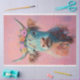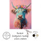 Vache Highland avec une couronne de fleurs, dressée contre un arrière - plan rose. Les cheveux longs et bruns de la vache sont crées dans des teintes vibrantes de bleu, d’orange et de blanc, créant un portrait fantaisiste et coloré. L'expression calme et neutre de la vache ajoute à l'atmosphère sereine et charmante de l'oeuvre d'art. Cette pièce allie magnifiquement des éléments de charme rustique et artistique, ce qui en fait un joli complément à toute collection