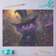 L'image représente une scène fantastique et fantaisiste avec un grand chat mauve grinçant aux yeux vert vif. Le chat porte un grand casquette élaboré orné de fleurs, de bijoux et d'une grande perle centrale. L'arrière - plan est rempli d'éléments colorés et vibrants tels que des fleurs, des lanternes et divers objets de décoration, créant une atmosphère magique et enchanteresse. Le cadre semble être un jardin ou une rue fantastique, avec une lumière chaude et éclatante qui illumine la scène. L'expression et la tenue du chat ajoutent un sentiment de mystère et de charme à l'image, la rendant visuellement captivante et intrigante. Scène lunaire, chat fantastique, chat violet, yeux vert vif, casquette élaboré, décorations florales, casquette bijoux, arrière - plan vibrant, atmosphère magique, jardin enchanteur, objets décoratifs, lumière brillante, expression mystérieuse, habillement charmant, visuellement captivant.