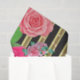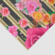 Design de papier de tissu floral avec des roses sur un arrière - plan à rayures verticales en or et noir.