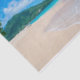 Papier de tissus avec une photo d'un magnifique lieu de vacances. Ciel bleu vif, plage de sable doux avec eaux cristallines cristallines bleu tropical. Une montagne couverte d'arbres luxuriants dans l'arrière - plan. Photographie pittoresque et tranquille.