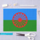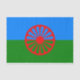 Ce dessin est orné du drapeau romani, qui est le drapeau international du peuple romani. Le drapeau est constitué d'un arrière - plan de bleu et de vert, représentant respectivement les cieux et la terre ; il contient également un chakra rouge à 16 branches, ou carrousel, au centre, qui représente la tradition itinérante du peuple romani et est aussi un hommage au drapeau de l'Inde. Le drapeau a été approuvé par les représentants de diverses communautés roms lors du premier Congrès mondial des Roms (WRC), qui s'est tenu à Orpington en 1971.