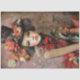 Mysterious and theatrical, this captivating portrait panel features an ethereal doll-like figure wearing a dramatic black top hat adorned with cascading coral roses, poppies, and blooms. A small songbird perches on her arm while layers of rich red ruffled fabric and delicate lace wrap around her — all set against a softly textured vintage floral background in dusty mauve, sage, and teal. Dark, romantic, and utterly distinctive, this is a design unlike anything else in the decoupage world.