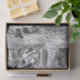 Ce papier de tissu pour votre emballage cadeau a un dessin vintage en noir et blanc de petite capuche rouge portant sa cape à capuchon portant un panier et un bouquet de fleurs s'arrêtant pour parler au loup dans les bois.