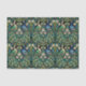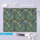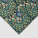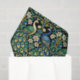 An opulent Tiffany–style repeating pattern inspired by stained glass artistry and ornamental Art Nouveau design. Elegant peacocks with sweeping tails in jewel-toned blues, teals, and emerald greens are arranged in a mirrored, symmetrical composition. Their feathered forms are intertwined with creamy white blossoms, curling vines, and stylized foliage, all outlined with a leaded-glass effect against a deep black background. The result is richly luminous and highly decorative.
