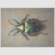 Représentation vibrante d'un scarabée métallique présentant son exosquelette iridescent exposé sur une surface texturée, avec des teintes dorées et turquoises associées à des accents orange subtils, offrant un équilibre esthétique.