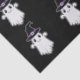 Dessin de Destei illustrant un joli personnage fantôme souriant. Le fantôme porte un casquette de sorcière aux détails violets. Le design se répète six fois en créant un petit motif. La couleur arrière - plan est noire, mais elle peut être changée en n'importe quelle autre couleur, si vous le souhaitez.