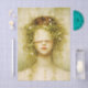 A soft, ethereal portrait of a young woman adorned with a delicate crown of trailing greenery and tiny white blossoms, her eyes gently covered by a wide, fabric blindfold. The composition is serene and dreamlike, with fine botanical details cascading from the headpiece, blending seamlessly into the softly textured background. She wears a high-necked, vintage-inspired dress with a row of subtle buttons, adding a refined and timeless elegance. The blindfold introduces a sense of mystery and symbolism—suggesting introspection, intuition, or a quiet connection to nature—while her calm expression enhances the peaceful, almost spiritual atmosphere. The palette is muted and harmonious, dominated by soft greens, warm ivory, and gentle earthy tones, creating a cohesive and soothing aesthetic. The entire piece is finished with a lightly aged, textured canvas effect, giving it the appearance of a softly weathered painting with a fine surface grain that enhances depth and softness. This design sits beautifully within themes such as botanical fantasy, Gothic romance, and ethereal portraiture, making it a versatile and striking focal piece for creative projects. Artwork similar to a classical oil painting blended with botanical illustration and soft-focus digital artistry……PERFECT FOR: Decoupage furniture projects, mixed media art, dark academia, botanical décor, Gothic romance themes, wall art panels, layered collage work, upcycling projects, feminine décor, artistic statement pieces… NOTE 1. The 18lb tissue paper is just the right weight for all your decoupage needs. The largest size is great for those big, bold projects, while the smaller sizes are perfect for adding detail to your other creations.