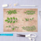 Six plantes feuillues à feuilles vertes sur fond sépia délavé en détresse. Parfait pour le découpage, le scrapbooking, les pages de journal et de nombreux autres travaux manuels.
