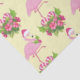 Papier de tissu à motifs avec un flamant de Noël à thème tropical portant un chapeau de santa rose. Sous ses pieds se trouve un bouquet de sucre de canne avec de jolies fleurs tropicales et des baies roses. Un bourgeon de saint sur sa poitrine.