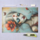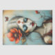 Un design captivant de papier de tissu pour découpage, avec une figure féminine éthérée et mélancolique liée à la nature. Son visage pâle, en porcelaine, est encadré de cheveux argentés fluides ornés d'une fleur de pavot rouge audacieuse et de délicats détails floraux. Des paupières bleues douces et fumées et des lèvres rouges profondes créent un contraste spectaculaire, évoquant une beauté surprenante. Les branches et les fleurs semblent pousser de sa peau, symbolisant un lien entre l'humanité et la nature. Un papillon vibrant flotte dans l'arrière - plan, ajoutant de la vie à la composition sereine mais hantante, avec des tons doux turquoises et chauds de terre complétant l'atmosphère. Parfait pour des projets inspirés par l'imaginaire, l'élégance gothique et la mystique de la nature