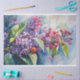 Une aquarelle vif présente une coccinelle reposant sur des fleurs lilas lumineuses entourées de verdure. L'oeuvre apporte une touche printanière animée et met en valeur la beauté des détails complexes de la nature.