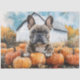 Un tableau d'aquarelle d'un Bulldog français assis parmi des citrouilles devant une grange blanche rustique. Des arbres d'automne encadrent la scène dans des tons dorés chauds, créant une atmosphère chaleureuse et saisonnière.