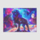 Lion majestueux à crinière bleue éclatante, debout fièrement sur fond de galaxie, rayonnant de puissance et d'élégance cosmique.