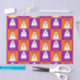 Ce papier de tissu génial présente un mignon petit fantôme blanc aux yeux noirs et une bouche noire large ouverte. Chaque fantôme est posé sur un carré orange ou un carré violet et chaque carré contient du texte orange ou violet qui dit Boo ! Le résultat est un motif de carrés et de fantômes.