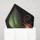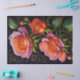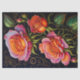 Sur un arrière - plan noir, l'oeuvre arbore un spray de roses orange et roses.