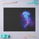 Grande méduse bleue, artistiquement dessinée, brillante, brillante, avec de longues tentacules sur arrière - plan noir avec bioluminescence violette. Méduse brillante.