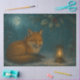 Peaceful and full of woodland magic, Lantern Fox Under the Holly Moon captures the quiet stillness of a snowy night. A gentle fox curls up beside a glowing lantern, bathed in moonlight beneath boughs of holly and evergreen. The soft painterly glow and deep forest blues make this piece feel like a moment suspended in time — serene, warm, and utterly enchanting.