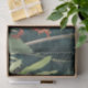 Turquoise Blue, Vintage Safari design a un Leopard pédoncule au milieu de la jungle tropicale avec des fleurs rouges, des palmiers et des bananiers verdure et feuillage avec écriture manuscrite, lettres manuscrites et phoques éphémère qui ont été dessinés graphiquement par Audrey Jeanne Roberts, artiste et designer de renommée internationale, copyright.