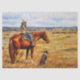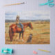 A young cowgirl waits for her to catch up so they can begin rounding up the cattle. Their trusty cattle dog sits eagerly watching the herd in the distance while the horse takes this opportunity to doze. Réaliste artwork created from an original oil painting by equine and wildlife artist Crista S. Forest.