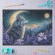 Loup assis sous une lune croissant avec des fleurs violettes tout autour de l'IA Art généré par minx267
