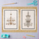 Une paire d'images de lustre de coordination. "Chandelier Vintage Architectural Dessin Français Lourd Poids Tissu Papier pour découpage." Un architecte aurait réalisé deux élégants dessins de lustre français et les aurait conçus pour créer l'éclairage au plafond d'une grande maison, d'un château ou d'un palais. La présentation est complétée par une feuille noire et dorée, une bordure marbrée et un arrière - plan de motifs floraux peints modernes en or moutarde qui a été créé dans les pastels à l'huile par Audrey Jeanne Roberts, artiste et designer de renommée internationale.
