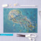tableau d'une méduse blanche et jaune dans l'eau bleue avec quelques bulles nageant dans l'eau bleue