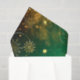 Design de papier mousseux à thème hivernal avec des flocons d'or, des anneaux d'or et des lumières floues et des étincelles sur un arrière - plan à dégradé vert.