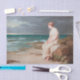 Cette oeuvre d'art classique présente une peinture à l'huile de John William Waterhouse appelée "Miranda" (1875), inspirée d'un personnage de William Shakespeare, "The Tempest". Il y a une jeune femme assise sur des rochers près de la mer, qui regarde vers l'océan.