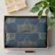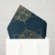 Un motif de belles mandalas d'or répété dans un motif damassé orné. L'or est brillant pour imiter la vraie feuille d'or. Les mandalas sont conçus avec des travaux de ligne tracés à la main et placés sur un arrière - plan bleu marine profond.
