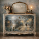 Moonlit couple walking riverside path decoupage featuring a couple strolling beneath glowing street lamps along a quiet river under a luminous moonlit sky. Soft reflections on the water and a peaceful evening atmosphere create a romantic European scene perfect for furniture art, cabinets, dressers, trays, and decorative craft projects.