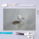 Sur une plage atlantique de côte, une mouette se tient contemplativement dans le sable humide, près d'un bloc d'algue
