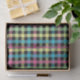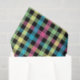 en vichy motif avec rose, vert, bleu, jaune et noir.