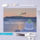 Ce papier de tissu de Noël présente le Père Noël volant au-dessus de Santorin, en grec.