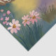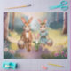 Un papier tissu de Pâques charmante et capricieux. Le style aquarelle lui donne une qualité douce et éthérée, et la famille de lapins anthropomorphes ajoute un élément narratif délicieux. L'illustration est faite à la main (aquarelle de Fantabuloustef) parfaite pour envoyer des souhaits chaleureux. Une élégante famille de lapins chasse les oeufs dans la forêt, par une matinée ensoleillée. Dans un beau décor arboré et fleuri, lapin maman, lapin papa et petit lapin marchent les mains dans les mains. Père Rabbit : Sur la gauche, un plus grand lapin habillé d'une veste en costume bronzé et d'une chemise blanche avec une cravate arc rouge. Il tient une corbeille tissée remplie d'oeufs colorés de Pâques. Mère Lapin : Sur la droite, un lapin légèrement plus petit portant une robe bleu clair avec une ceinture bleu foncé autour de la taille et une petite cravate arc rouge. Elle porte aussi un panier d'oeufs de Pâques. Elle a une délicate couronne florale sur la tête. Lapin : Au centre, un petit lapin habillé d’une veste en costume vert et d’une chemise blanche tient la main de son père et marche avec bonheur. Les lapins marchent sur un chemin à travers une forêt. Les arbres aux couleurs douces et muettes donnent un cadre de printemps doux. Le sol est un mélange de brun, de vert et de pourpre, ce qui indique le feuillage et les fleurs. Le tableau présente une technique douce et mélangée d'aquarelle. Les couleurs sont légèrement tamisées, créant une atmosphère onirique et douce. Les coups de pinceau sont visibles dans certains endroits, ajoutant à l'impression artisanale. Ce papier tissulaire évoque, le printemps, le renouveau et la chaleur familiale joyeuse d'une chasse aux oeufs de Pâques !