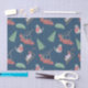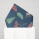 Papier en tissu de Noël bleu avec un design charmant de sapins, d'oiseaux habillés en chandail avec des oreillons, des feuilles verts saints, des sprigs de baies sèches et des traîneaux remplis de cadeaux de Noël pour ajouter une touche unique et fantaisiste à votre emballage cadeau de Noël cette année.