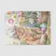 This watercolor illustration showcases a long-haired, orange tabby cat in a vibrant flower garden. Dressed in an Easter hat and accompanied by colorful eggs, the cat adds charm to this spring-themed design. The background features blooming spring flowers in shades of red and yellow. Ideal for cat enthusiasts, this Easter tissue paper is perfect for gift wrapping, embellishing gift bags, and various crafting projects.
