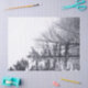 Immergez-vous dans un pays des merveilles hivernales avec la photo verticale en noir et blanc, Arbres couverts de neige. Les arbres forment une diagonale forte avec l'arbre le plus haut qui commence au coin supérieur gauche de l'image et l'arbre le plus court au tiers inférieur du bord droit. Les deux arbres sur la gauche sont des verdures persistantes tandis que les autres sont des feuillus sans feuilles, tous recouverts de neige. Le ciel au-dessus d'eux est blanc. Photographie numérique, noir et blanc. Copyright © Claire E. Skinner. Tous droits réservés.