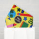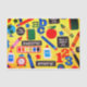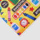Papier-cadeau pour les enseignants avec l'image de crayons colorés et d'autres fournitures scolaires contre un arrière - plan jaune.